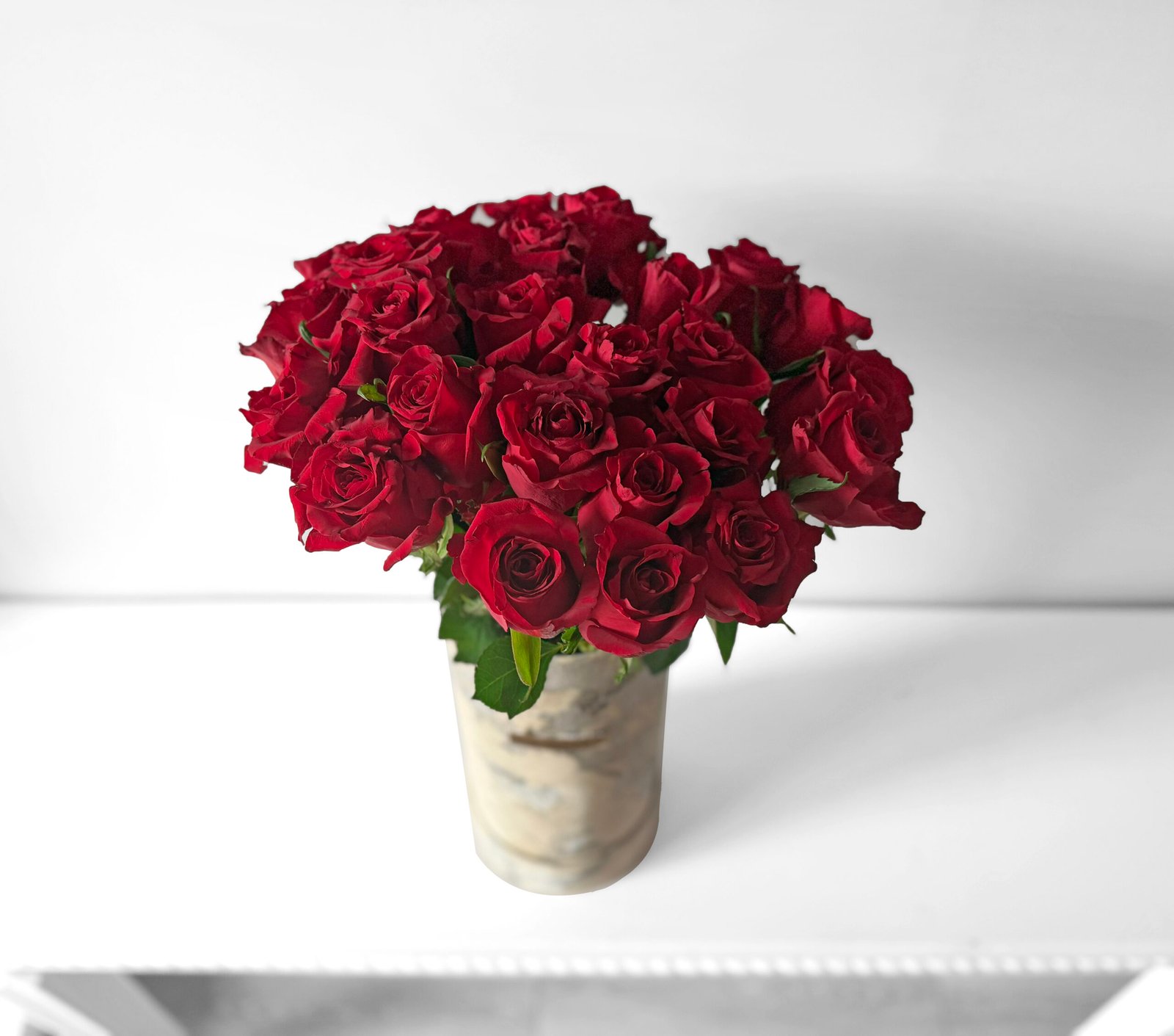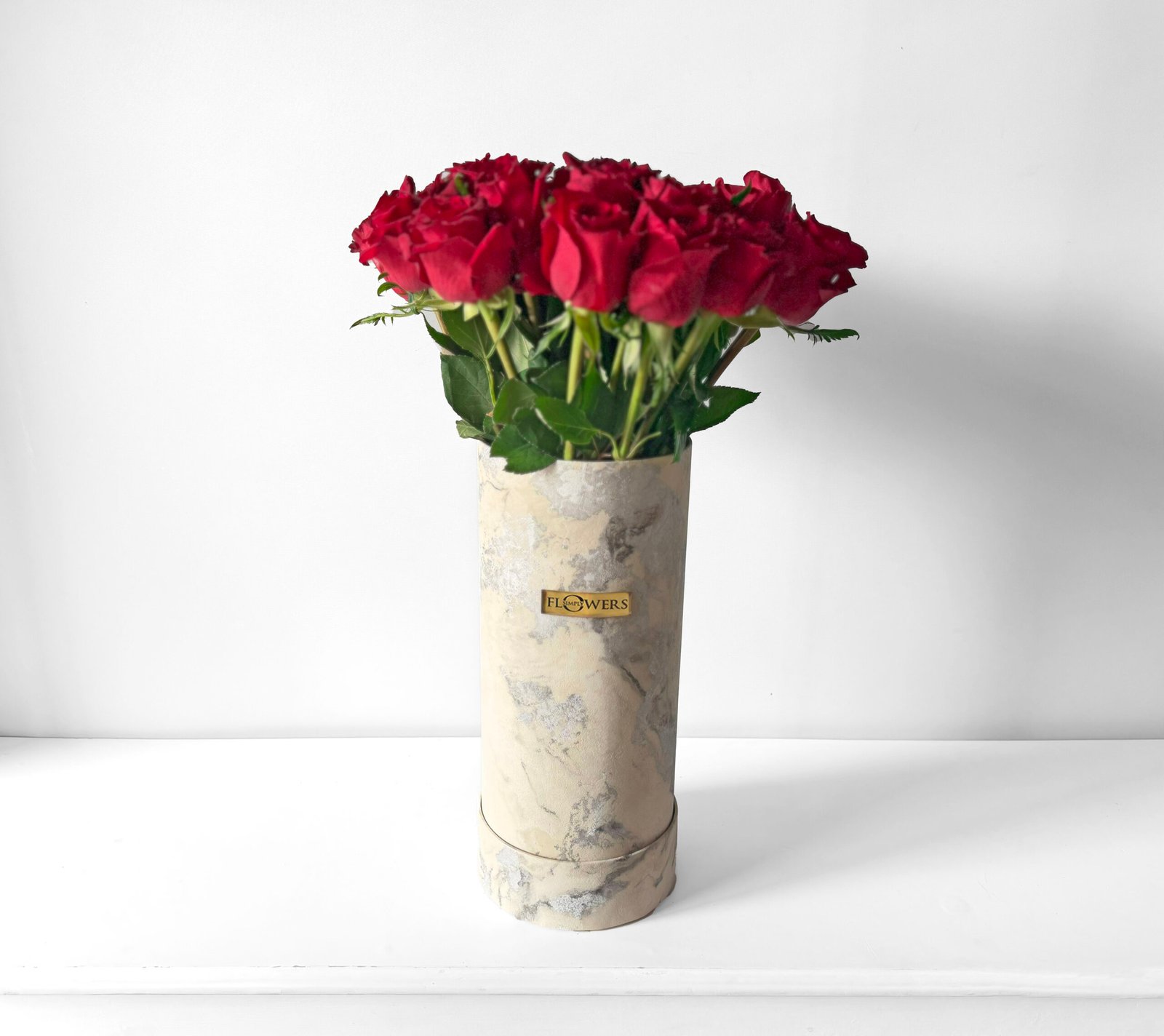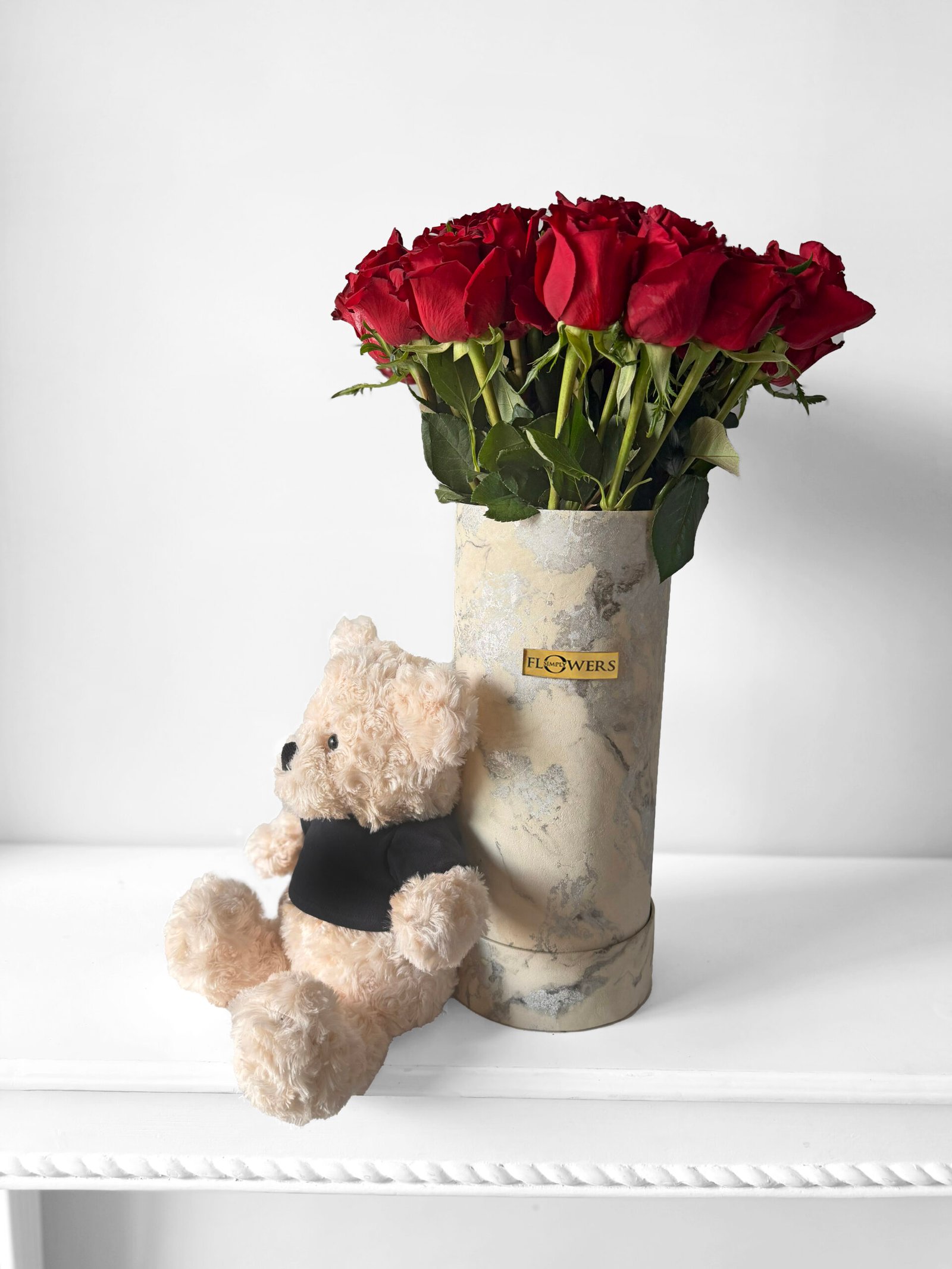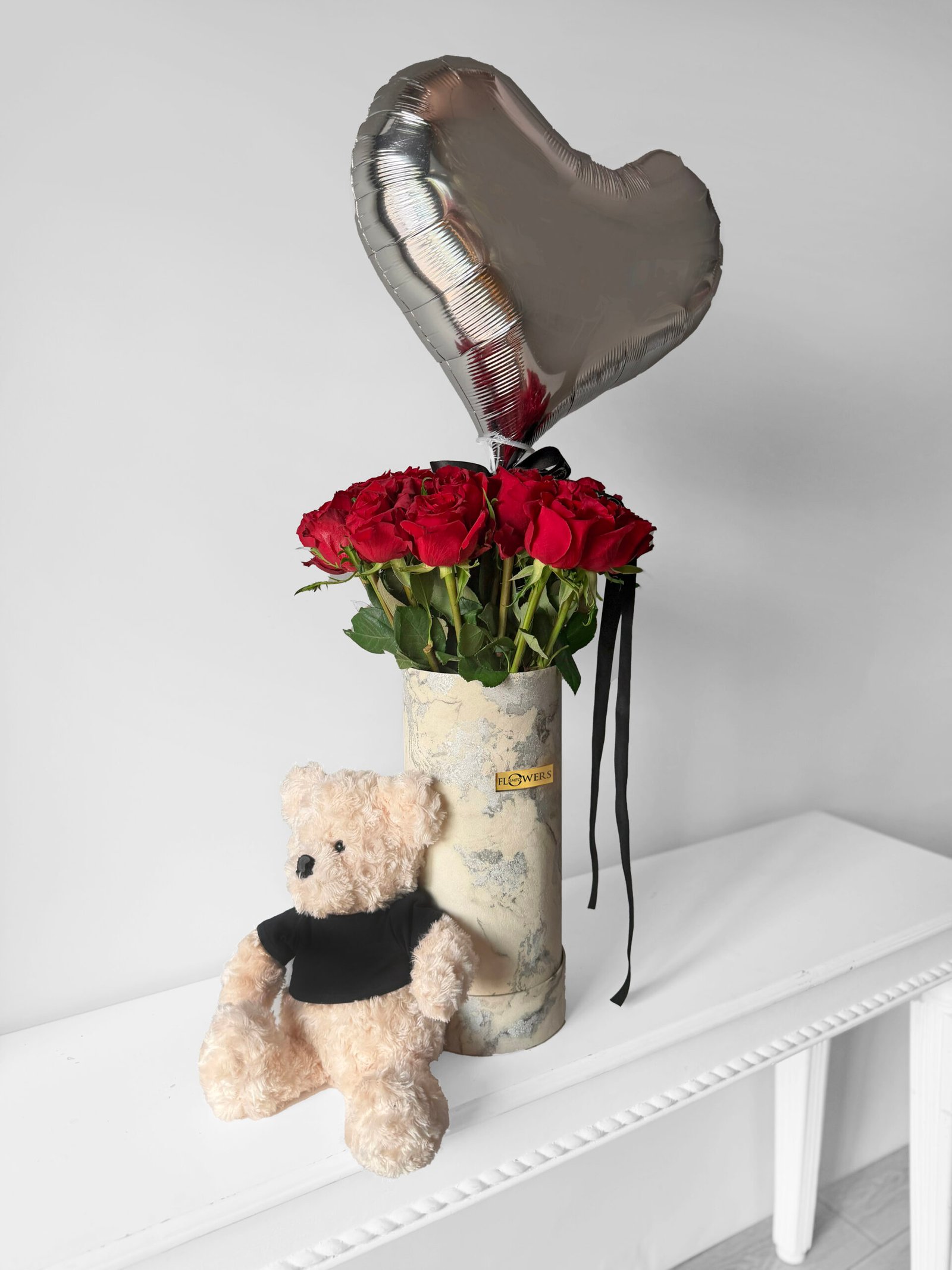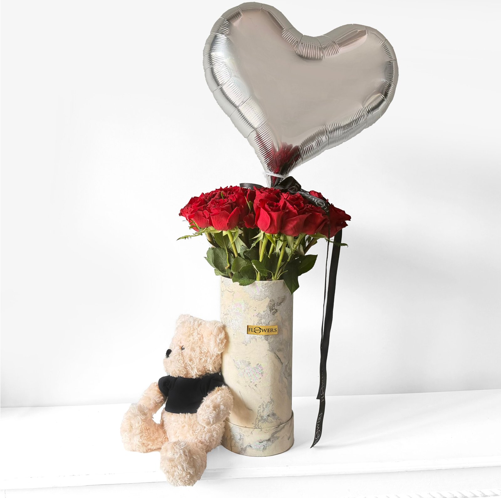 30 red roses in our signature silver & white marble print hat box with a complimentary bear & a balloon