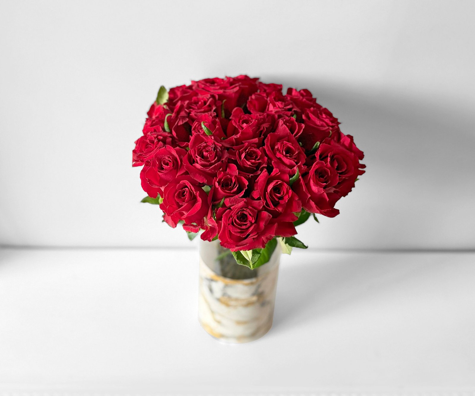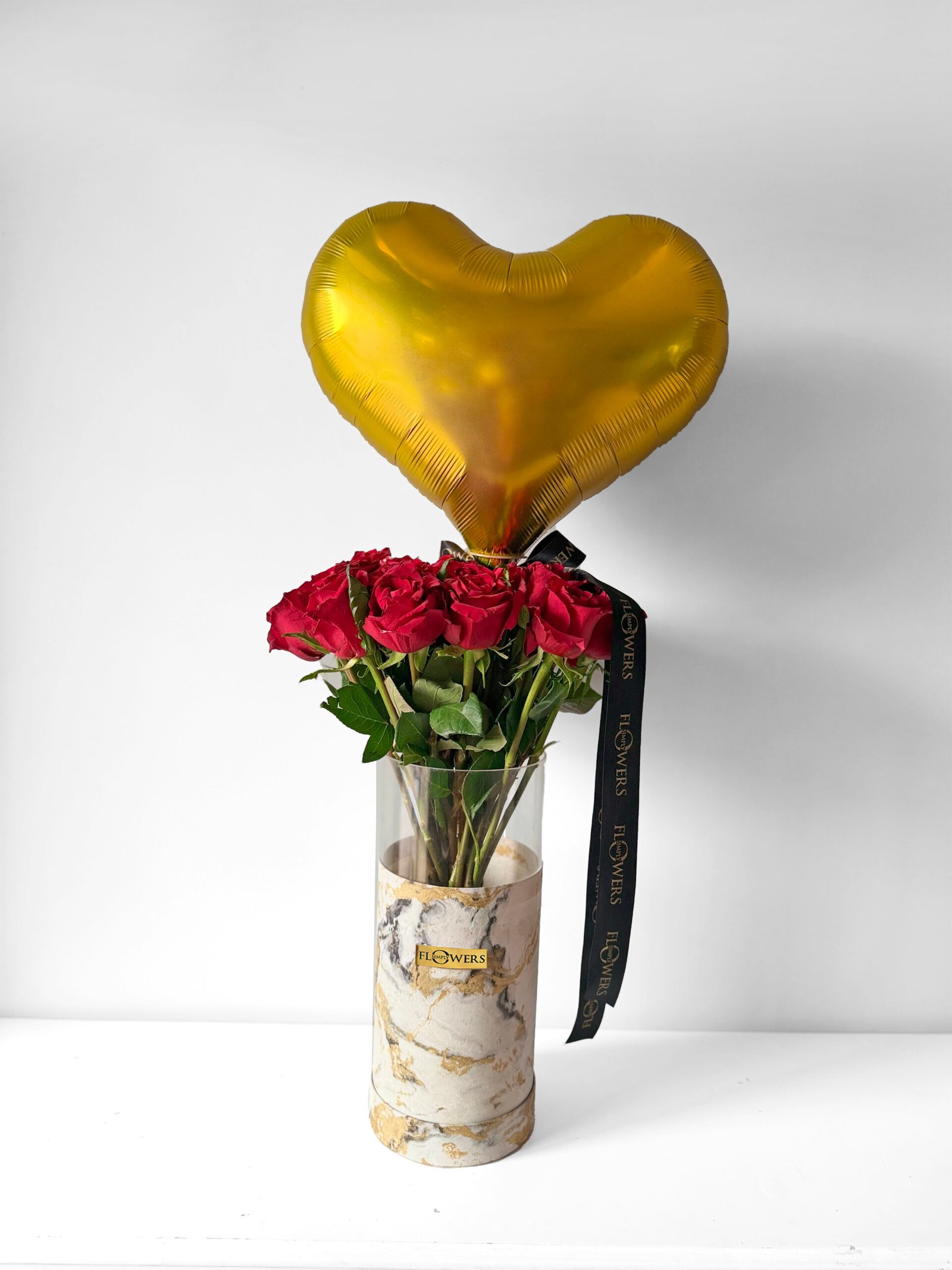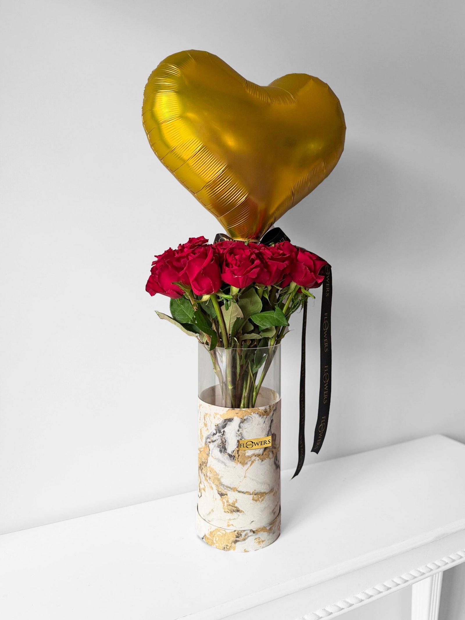 30 red roses in our signature marble print hat box with a complimentary balloon
